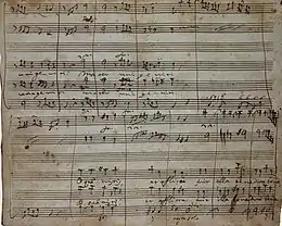 Many pieces which were said to have been composed by Pergolesi have been misattributed; the Stabat Mater is definitely by Pergolesi, as a manuscript in his handwriting has been preserved.[4] The work was composed for a Neapolitan confraternity, the Cavalieri della Vergine dei Dolori di San Luigi al Palazzo,[5] which had also commissioned a Stabat Mater from Alessandro Scarlatti.[6] Pergolesi composed it during his final illness from tuberculosis in a Franciscan monastery in Pozzuoli, along with a Salve Regina setting,[2][3] and, as it is said, finished it right before he died.