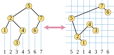 Stack-sortable permutations may also be translated directly to and from (unlabeled) binary trees, another combinatorial class whose counting function is the sequence of Catalan numbers. A binary tree may be transformed into a stack-sortable permutation by numbering its nodes in left-to-right order, and then listing these numbers in the order they would be visited by a preorder traversal of the tree: the root first, then the left subtree, then the right subtree, continuing recursively within each subtree. In the reverse direction, a stack-sortable permutation may be decoded into a tree in which the first value x of the permutation corresponds to the root of the tree, the next x − 1 values are decoded recursively to give the left child of the root, and the remaining values are again decoded recursively to give the right child.[1]