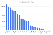 As of March 2022 Stack Overflow has over 20 million registered users,[15] and has received over 24 million questions and 35 million answers.[16] The site and similar programming question and answer sites have globally mostly replaced programming books for day-to-day programming reference in the 2000s, and today are an important part of computer programming.[17] Based on the type of tags assigned to questions, the top eight most discussed topics on the site are: JavaScript, Java, C#, PHP, Android, Python, jQuery, and HTML.[18]