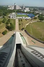 The Olympic swimming pool is located under this tower. An Olympic velodrome (since converted to the Montreal Biodome, an indoor nature museum) was situated at the base of the tower in a building similar in design to the swimming pool. The building was built as the main stadium for the 1976 Summer Olympic Games. The stadium was host to various events including the opening and closing ceremonies, athletics, football finals, and the team jumping equestrian events.[13]