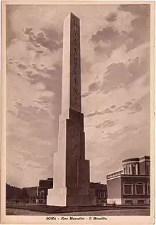 Early on, the Fascist movement saw the potential of using sports to promote its political and economic ideologies.[5] Immediately after the March on Rome, the Fascist regime invested in large-scale sports arenas, buildings, and institutions, such as the Stadio dei Marmi, which made sports accessible to all classes of society.[6] Through sports, Fascist institutions emphasized and promoted Fascist values, which developed a national identity.[6] The most prevalent and valued sports included combat sports such as boxing, Greco-Roman wrestling, and javelin, hammer, or stone throwing.[7] Through physical education and sports, the Fascist government aimed to create professional militia and warriors, who would readily enter war.[7] Mussolini began the construction of the Foro Italico in 1928 as the central sports city and, in 1932, he opened the Instituto Superiore Fascista di Educazione (Fascist Institute for Physical Education) as the first male athletic institution.[8] The importance that the Fascist regime placed on male physical education highlighted the characteristics of the ideal Fascist citizen, as well as the rigid gender binaries it instilled within Italian culture.[9] After its unveiling, the Stadio dei Marmi became the leading physical education training center for the Gioventù Italiana Littorio, the youth movement of the National Fascist Party of Italy.[10] During the Fascist period, the Stadio and complex became the nation's center for athleticism and increasingly renowned until Italy joined the war in 1940.[8] According to the historian Eden K. McLean, "the Mussolini Forum was designed to forge educators and political leaders united by an Italian-Fascist sensibility about the past, present, and future of the race."[8]