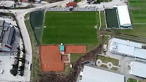 Putevi Užice, owned by Vasilije Mićić, was the main contractor for the venue's construction.[3] As the main financier of the club, he decided to build a stadium and all auxiliary facilities with his company. In 2003, he bought the hotel Palisad, within which he built 4 football fields, which would be used for the preparatory matches of FK Jedinstvo Putevi. He had planned to build 10 more such fields, but his death at the age of 76 prevented him from doing so. He died on December 20, 2020, in Moscow.