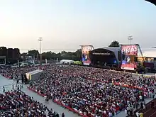 Since 2012, the stadium sees over 15,000 people at the park for the annual Access All Eirias Music Festival. This includes singers like Olly Murs, Pixie Lott, Cover Drive, Little Mix and Welsh performers Tom Jones and Rhydian Roberts.[18][19]