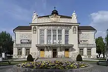 When it deteriorated, a new house was designed by the Viennese architecture office Fellner & Helmer, who had already built the very similar theatres in Gießen and Gablonz, in 1906 and 1907.[1] Building began in 1908 and was completed in 1910. The house was opened on the occasion of the 60th jubilee of Franz Joseph I of Austria and therefore named "Kaiser Franz Joseph I. Jubiläumstheater".