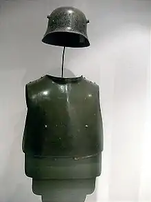 In 1938, the Germans developed a variant of the Stahlhelm with a wider, flared peak and ventilation holes originally intended for civil defense and Luftschutz personnel.[25][26] Known as the gladiator pattern, the privately purchased Luftschutz helmet was originally made from three pieces of steel and typically painted black or dark blue.[27] Later in the war these were issued to Volkssturm personnel, and sometimes repainted in Feldgrun.[28][29] By 1944, the helmets were stamped from a single steel sheet, and the original leather lining replaced with vinyl or cloth to reduce costs.[30] A modified postwar version in fluorescent green, white or yellow continued to be issued to rescue workers in the Bundesrepublik until the early 1990s.