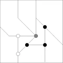 Stained Glass is played on a field of intersecting vertical, horizontal, and diagonal lines. At the intersections of some of these lines are small circles, either unshaded, grey shaded, or completely darkened.