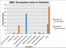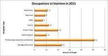 In the 2011 census the recorded number of economically active people in the parish was 226 and of those, 146 were economically active.[1] With this table it is possible to compare the 1881 occupation statistics with those of 2011. As the 1881 graph shows the most significant occupations other than the unknown ones were agriculture and domestic.[15] In 1881 it is highly likely the parish would have been surrounded by farmland and there may not have been as many opportunities available as there would have been in 2011. The largest sector in 2011 was professionals and associate professionals which compared to only 4 in 1881 is a large expansion.[15][1] This shows that over 130 years the dominant occupation roles have shifted from agriculture to professionals and also managers and directors. This might be due to improved transport links to larger cities and the demand for higher wages and a decrease in family run farms for a source of income. From studying the 2011 occupation statistics they suggest Stainton may have a slightly wealthy domain about it and also more of a middle aged to older aged population. The smallest sectors in 2011 were sales and administrative jobs,[1] for example shop work or office work. This may be due to one person in a household earning a higher income so the other takes a more relaxed job role or because these types of jobs tend to have more flexible hours making it more suitable to fit around family life.