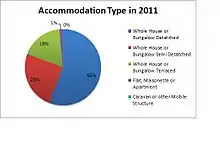 These two graphs show the number of people who live in each household in Stainton and also the type of households that dominate the parish of Stainton. The graph on the left concentrates on the number of people who occupy households in the parish. As the data shows two person households dominate the parish with 46.75% (56) houses.[1] Owing to this dataset it could potentially mean that the houses are occupied by married couples without dependent children or even retired couples who have chosen to live in the parish. The graph also shows that there are not many houses occupied by larger families as only eight houses have five people or more in them. These few houses could be families who have dependent children, although it does not seem that there are many households of this composition so it may not entice families looking to move to live in the Stainton. The pie chart on the right shows the type of households which are in the Parish. The majority of the homes are detached or bungalows, followed by semi-detached homes.[1] Due to over half of the homes being detached it shows that it is unlikely that there is a street lined with houses along them. These homes may be occupied my small families, married couples or retired workers.