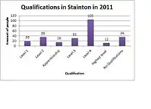 In the Parish of Stainton there are 255 members who are 16 and over.[1] As the Graph shows 219 of these have qualifications between level one and the highest level of qualification including apprenticeships. As the graph shows, 105 people who live in the village have gained a level four qualification which is the greatest percentage at 41.2% of the total number. This shows that some members of the village whether they are retired or not may have or had reasonable occupations due to their level of education. This can be backed up by looking at the occupation statistics in 2011 as 51.8% of the parish were managers/directors or in the professional sector.[1] Out of 255 people, 36 in the parish have no qualifications[1] which could suggest that they didn't attend school or they didn't complete it. However it could also suggest that they may have lived their whole lives on a family run farm and taken over from previous generations.