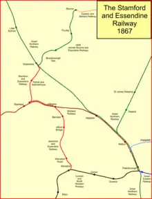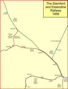 In 1866 the Midland and Eastern Railway was formed by amalgamation of the Lynn and Sutton Bridge Railway and the Spalding and Bourne Railway. The intention had been to build westward from Bourne to Saxby to join the Midland Railway there (as was done later in forming the Midland and Great Northern Joint Railway). The GNR opposed this scheme, and in negotiation offered the Midland through running at Essendine over the Bourne and Essendine Railway, which by then had been over by the GNR) and the S&ER.[5][6] The Midland Company sought this access eastwards, and found that it was in its own interest to facilitate the junction at Stamford. There was a technical issue: the MR were concerned that the end of the junction tracks would be on an S&ER viaduct considered to be in poor condition, and they insisted on its conversion to an embankment. That work was done and the junction came into use on 1 July 1867. The difficulty over through running at Essendine was also overcome, as the GNR ran three mixed trains daily from Stamford to Lynn via Bourne and Spalding.[1]