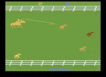 The objective of Stampede is to round up all of the cattle without letting any pass by. To do so, the player must lasso each one in order to capture it. The player is initially only allowed to let two cattle pass; if a third one slips by, the game is over. All of the cattle run in the same direction as the player, albeit slower. The one exception is the Black Angus calf, which is described by the game as "stubborn", and remains motionless, forcing the player to prioritize the calf.