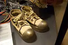 The helmet divers used heavily weighted shoes to steady them on the bottom. The weighted sole is bolted to a wooden insole, which in turn has a leather, canvas or rubber upper. Metal was the most common sole material, and a pair could weigh 34 pounds (15 kg) (more in the case of the US Navy Mark V mod 1 heliox equipment). Brass soled shoes with canvas uppers were introduced in WWII and are still in use. Some early brass shoes were called sandals because they were a casting held to the diver's feet by simple straps. Japanese divers often used iron soled shoes. The diver tends to lean forward against the drag of the water when walking on the bottom, and could often not see where he was putting his feet, so the toes are capped, usually with brass.
