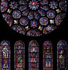 The visual image (from Bernard of Chartres) appears in the stained glass of the south transept of Chartres Cathedral. The tall windows under the rose window show the four major prophets of the Hebrew Bible (Isaiah, Jeremiah, Ezekiel, and Daniel) as gigantic figures, and the four New Testament evangelists (Matthew, Mark, Luke, and John) as ordinary-size people sitting on their shoulders. The evangelists, though smaller, "see more" than the huge prophets (since they saw the Messiah about whom the prophets spoke).