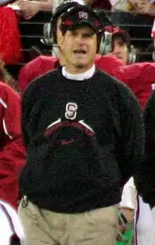 Jim Harbaugh was named the head football coach at Stanford University in December 2006, replacing Walt Harris.[67] Harbaugh's father, Jack, was Stanford's defensive coordinator from 1980 to 1981, while Harbaugh attended Palo Alto High School, located directly across the street from Stanford Stadium.[68]