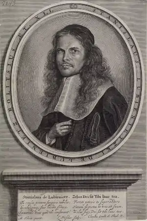 Stanisław Lubieniecki (German: Stanislaus de Lubienietz, also Lubiniezky or Lubyenyetsky) (August 23, 1623 in Raków – May 18, 1675 in Hamburg) was a Polish Socinian theologist, historian, astronomer, and writer. He is the eponym of the lunar crater Lubiniezky.
