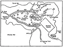 The Stanley site was chosen by the Japanese through consultation with two Hong Kong government officials – Dr. P. S. Selwyn-Clarke, Director of Medical Services, and F. C. Gimson, the Colonial Secretary.[8] Located on Stanley Peninsula, which was about nine kilometres from the city at the time,[9] the camp consisted of St. Stephen's College and the grounds of Stanley Prison, excluding the prison itself; the prison was used by the Japanese authorities to hold what they considered "criminals" from Hong Kong.[10] Several hundred internees lived at St. Stephen's, while the majority of them lived on the prison grounds. Prior to Japanese occupation, St. Stephen's was a secondary school whose facilities, in addition to classrooms, included an assembly hall, bungalows for teachers, and science laboratories. Over twenty internees occupied each bungalow, which was built for one family, and more than that occupied each science laboratory, living between partitions of sacking and old blankets.[2] Almost all the buildings in the camp were used for housing.[11]