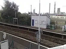 Stanlow and Thornton railway station is located within the Stanlow Refinery in Cheshire, England. It lies on the Hooton–Helsby line with services operated by Northern Trains. The station is surrounded by the refinery site, so as a result most station users are refinery employees.[1] In 2018–19 it was the joint least-used railway station in Britain, tied with Denton in Greater Manchester.[2] In 2020/21, the station was also one of the least used stations in Britain, with 0 entries/exits. Since 3 February 2022 the station has been temporarily closed due to safety concerns of the footbridge which is the only entrypoint to the station.[3]