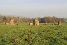 The most famous feature is the Great Circle, the second largest stone circle in Britain (after Avebury). The stone circle is 113 metres (371 ft) in diameter and probably consisted of 30 stones, of which 27 survive today.[3] It was recorded by both John Aubrey in 1664 and William Stukeley in 1776.[4][5] The Great Circle probably was surrounded by the ditch (approximately 135 metres (443 ft) outer diameter — now filled in) of a henge.[6] The North East Circle is 30 metres (98 ft) in diameter and probably consisted of 10 or more stones, of which 8 survive today. The South West Circle is 43 metres (141 ft) in diameter, and has 12 stones surviving today. An avenue extends to the northeast of the Great Circle towards the River Chew and a second avenue meets it from the north eastern stone circle.[7][8][2]