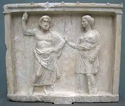 As one of Rhadamanthys' generals, he was the founder of the colony of Peparethos on the island of Skopelos, in the Northern Sporades island chain.[8] Staphylus dwelt in Naxos and was married to Chrysothemis, by whom he had three daughters: Rhoeo, who was a lover to Apollo,[9] Parthenos, and Molpadia or Hemithea.[10] The latter became the mother of Basileus with Lyrcus, after Lyrcus had made a journey to the oracle at Didyma. Staphylus is said to have enticed Lyrcus into too much drinking of wine and then, when Lyrcus' senses were dulled by drunkenness, united him with Hemithea.[11]