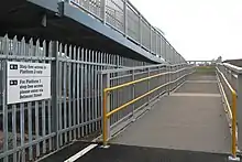 The station is on an alignment of 150 degrees, curving towards the east.[2] There are two active platforms: the western platform, platform 1, serves northbound trains; the eastern platform, platform 2, serves southbound trains. Platform 1 is 216 metres (236 yd) in length, and platform 2 211 metres (231 yd), but both have the southern 100 metres (110 yd) fenced off.[5] The southern end of the platforms bridge the residential street St Mark's Road.[6] Platform 2 is part of an "island" platform, the other face of which served the northbound "up fast" line through the station, which was removed in 1984 along with the southbound "down fast" and fourth platform which served it.[7] Access between the platforms is via an open, stepped footbridge.[3]