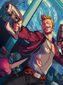 When the Kree homeworld of Hala is conquered by the Phalanx, Star-Lord leads a band of rebels against the invaders until the war is over.[36][37][38][39] In an effort to prevent another interstellar war, Star-Lord forms a new version of the Guardians of the Galaxy. They are "proactive" and try to end emerging galactic threats early,[40] but are unsuccessful at preventing a war between the Kree and Shi'ar. During a war with an invading universe, Star-Lord and Nova are prepared to sacrifice themselves to defeat Thanos[41] but only Nova dies and Thanos escapes.[42][43][44]