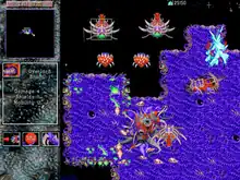 StarCraft's first expansion, Insurrection, was released for Windows on July 31, 1998.[52] The expansion was developed by Aztech New Media and authorized by Blizzard Entertainment.[53] Its story focused on a separate Confederate colony alluded to in the manual to StarCraft, following a group of Terran colonists and a Protoss fleet in their fight against the Zerg and a rising local insurgency. Insurrection was not received well, being criticized by reviewers for lacking the quality of the original game.[54] Insurrection was followed within a few months by a second expansion, Retribution. Developed by Stardock, published by WizardWorks and authorized by Blizzard Entertainment,[53] Retribution follows all three races attempting to seize control of a powerful crystal on a Terran Dominion colony. The expansion was not received with critical support, instead being regarded as average but at least challenging.[55] After the release of Retribution, Blizzard Entertainment announced a new official expansion pack that would continue on the story of StarCraft. StarCraft: Brood War was consequently created, developed jointly by Blizzard Entertainment and Saffire. Brood War continues the story of StarCraft from days after its conclusion, and was released for both Windows and Mac to critical praise[56][57] on December 18, 1998, in the US and in March 1999 in Europe.[58]