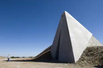 The Star Tunnel is entered through an enormous excavation of two 30-foot-tall, curved sandstone walls rising up to an elliptical opening that traces the path Earth's axis draws throughout precession.[5][3] The other chambers of Star Axis embody additional celestial phenomena. The relatively small "Equatorial Chamber" is located at the bottom of the Star Tunnel and frames the passage of the sun on the equinox through an opening at the top enabling viewers to also observe the stars that travel directly above the equator.[5][3] The top third of the Star Tunnel continues into the 52-foot-high "Solar Pyramid," whose angles were determined by the summer and winter solstices. It casts shadows like a sundial, marking daily and seasonal sun movements on the bowtie-shaped, exterior "Shadow Field," which is bounded by the tracings of the longest shadow at winter solstice and the shortest at summer solstice.[10][6][3][4] Inside the Solar Pyramid in the "Hour Chamber," which includes a 29-foot-high, 15˚ triangular aperture framing one hour of the earth’s rotation; in that time, any given star will take sixty minutes to arc from the opening’s left (west) edge to the right (east) edge, while Polaris remains at the apex due to the alignment of the structure.[3][4][2]