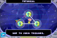Star Trigon is a puzzle action video game. Controlling a character, the player is tasked with rescuing the Uchijins drifting through space under a time limit, done by hopping planet to planet to form large triangles.[1] An Uchijin will be collected if it is in a triangle once completed, and the player would progress to the next stage once all the Uchijins are saved.[1] The player rotates around the planet it is standing on, and can jump to another by pressing the button;[1] jumps must be timed carefully to avoid falling off the playfield and losing a life.[1] The player has an oxygen meter that will deplete as the stage progresses, but can be replenished by collecting air capsules.[1]