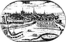 Stargard was part of the Duchy of Pomerania until its dissolution after the death of the last duke Bogislaw XIV in 1637.[5] During the Thirty Years' War the city was captured by Sweden in 1630.[6] It was besieged by the troops of the Holy Roman Empire in 1635,[8] and in order to hamper the attacks the Swedish commander set fire to the suburbs, causing a city fire, however, it was still captured by imperial troops.[9] In 1636 it was recaptured by the Swedes, then it was taken and plundered by Imperial troops to fall back to the Swedes again after the Battle of Wittstock.[10] In 1637 it was again captured by Imperial troops and then by Sweden.[10] As a result of the war, the population decreased by about 75%.[11]