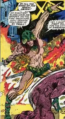 Starr the Slayer was a trial run for Conan by Roy Thomas and Barry Smith, the original creative team of the Marvel Conan comics. Starr looks and acts like Conan but was created before Marvel Comics acquired the rights to publish stories featuring Conan.[2]