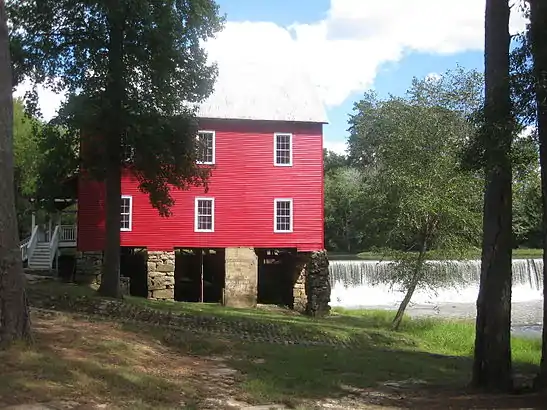 "The property that became Starr's Mill was owned by Hananiah Gilcoat who built the first mill here before his death in 1825. This site, on Whitewater Creek, was less than a mile from the boundary between Creek Indian lands and the State of Georgia. Hilliard Starr, who owned the mill from 1866 until 1879, gave the site its current name. After the first two log structures burned, William T. Glower built the current building in 1907. This mill operated until 1959, using a water-powered turbine, instead of a wheel, to grind corn and operate a sawmill. The Starr's Mill site also included a cotton gin and a dynamo that produced electricity for nearby Senoia."[2]