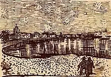 Included a small sketch of a 30 square canvas - in short the starry sky painted by night, actually under a gas jet. The sky is aquamarine, the water is royal blue, the ground is mauve. The town is blue and purple. The gas is yellow and the reflections are russet gold descending down to green-bronze. On the aquamarine field of the sky the Great Bear is a sparkling green and pink, whose discreet paleness contrasts with the brutal gold of the gas. Two colorful figurines of lovers in the foreground.[3]
