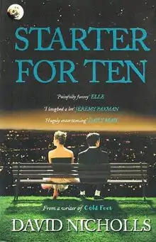 Starter for Ten by David Nicholls is a novel first published in 2003 about the character Brian Jackson and his first year of university (1985–86), his attempts to get on the Granada Television quiz show University Challenge, and his tentative attempts at romance with Alice Harbinson, another member of the University Challenge team.[1] The title is taken from an opening question to a round on the quiz show worth ten points, known as the teams' "starter for ten". Because this reference might be lost on American readers, it was originally released as A Question of Attraction when it was published in the United States.