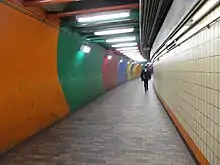 - The passageway to the southbound Orange Line platform was painted with rainbow colors by Robert V. Kennedy in March 1972. The painting and corresponding timed lighting (no longer in use) cost $9,000.[8][9][10] Kennedy won the 1971 competition to design artwork for the station.[11]