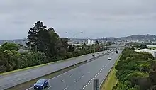 The Auckland Comprehensive Transportation Study Review (1986) confirmed the Southwestern Motorway between Dominion Road and Māngere was a top priority of the Auckland Regional Authority.[4] By 1987, the Papatoetoe Bypass was completed, linking Massey Road to the south, ending at a roundabout meeting Puhinui Road.[5] The gap between Coronation Road and Massey Road, known as the Māngere Extension, was not completed until 1997.[5] The Manukau Extension, connecting Puhinui Road to the Southern Motorway (bypassing Wiri Station Road) was completed in 2010.[12][5] A duplication of the Māngere Bridge, with future provision for rail, was also opened in 2010.[13][14]