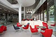 Further space was required for collection storage and public spaces, as well as staff work areas. Space became available south of the Mitchell Wing in the 1970s, when several buildings were demolished and Richmond Villa relocated to accommodate a new building for State Parliament, although this was initially used for temporary accommodation for parliamentary staff.[8] Work began on the Macquarie Street Wing in 1983 and it was opened in 1988—Australia's bicentenary—by Queen Elizabeth II in company with Prince Philip. The new building fronts Macquarie Street and links up with the Mitchell Wing above ground and below ground. Andrew Andersons of the Government Architects Office was the design architect for the Macquarie Street Wing.[4][46] The Government Architects Office was again engaged in 2011 for planned renovations for the building resulting in a redesigned reading room and construction of a new learning space for education programs. Work commenced in 2011[49] and was completed in 2012.