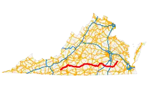 State Route 40 (SR 40) is a primary state highway in the southern part of the U.S. state of Virginia. It runs from SR 8 at Woolwine east to SR 10 at Spring Grove, about half the width of Virginia. It is the longest state-numbered (not U.S. or Interstate) route in Virginia.