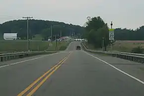 Since 2017, the southern terminus of SR 93 has been at the Kentucky state line on the Oakley C. Collins Memorial Bridge over the Ohio River. It travels through downtown Ironton on South Second Street and Park Avenue unsigned.[1][2] After exiting the city limits, it comes to at an interchange with U.S. Route 52 (US 52), the route's former terminus. As of 2018, this interchange is signed as the beginning of SR 93.[3] The route goes through Wayne National Forest and Lake Vesuvius. After leaving Wayne National Forest, the route enters Jackson County and the town of Oak Hill where it intersects with SR 140 and SR 279. The route passes through less hilly areas as it once did in Lawrence County. The route passes through Jackson, and in the village of Coalton, State Route 93 makes a sharp turn eastward to Wellston, where it overlaps SR 327. After Wellston, SR 93 returns on its northerly route to Hamden, McArthur, Logan, New Lexington, Crooksville, and Zanesville. Between Zanesville and Ironton, SR 93 is a busy truck route and used by many travelers as well. Leaving Zanesville, the route is less traveled heading north to Canal Fulton, whence it gradually becomes more and more traveled as it approaches the Portage Lakes region. From this point to its northern terminus, it is a road in which traffic jams are expected during rush hour.