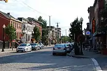 Lark Street is the main street of Midtown Albany, as well as the Hudson/Park and Center Square neighborhoods. Lark Street, like all the bird streets from De Witt's plan runs north–south. Lark runs north from Myrtle Avenue to Clinton Avenue, a second section starts on Clinton Ave just east of the first section and runs north to Manning Boulevard. On paper Lark Street still runs from Myrtle Ave south to the intersection of Morton Avenue and Hackett Boulevard though this section is not currently built, with the exception of a short common access for a Walgreens and McDonald's on Morton Ave. From Madison Ave to Clinton Ave, Lark Street is US Route 9W.
