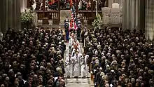 During a national funeral service, such as those held at Washington National Cathedral, the Cathedral Choir or the Armed Forces Choir will sing a selection of religious and patriotic music. In 1969, Dwight D. Eisenhower's state funeral included a religious service at the Cathedral that incorporated music such as Schmucke dich, o liebe Seele by Johann Sebastian Bach and O Welt, ich muss dich lassen by Johannes Brahms.[68] During the state funeral of Ronald Reagan in 2004, Joyful, Joyful We Adore Thee by Ludwig van Beethoven and Mansions of the Lord by Nick Glennie-Smith were performed in the Cathedral.[98] The state funeral of Gerald Ford in 2006–07 included music such as O God, Our Help in Ages Past by William Croft, Eternal Father, Strong to Save (also known as The Navy Hymn), and Fanfare for the Common Man by Aaron Copland.[99] In 2018, the state funeral of George H. W. Bush included the hymns The King of Love My Shepherd Is by Henry Williams Baker, My House Shall Be Called a House of Prayer by Douglas Major, Eternal Father, Strong to Save, and Croft’s O God, Our Help in Ages Past.[100] During John F. Kennedy's Requiem Mass at the St. Matthew's Cathedral in 1963, the St. Matthew's Choir sang Subvenite and Sanctus and Benedictus. Tenor soloist Luigi Vena sang Pie Jesu by Ignace Leybach, Ave Maria by Franz Schubert,[101] and In Manus Tuus by Vincent Novello. The organist and choirmaster was Eugene Stewart.[97][101]