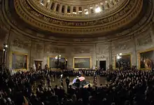 The funeral procession traditionally ends at the center steps on the east front of the Capitol. Exceptions were made for Lyndon B. Johnson, Ronald Reagan, and Gerald Ford. Johnson's casket was carried up the Senate wing steps because the center steps were blocked with construction scaffolding from the second inauguration of Richard Nixon which occurred just days earlier.[75] As a break with tradition, Reagan, as former Governor of California, requested that his casket be carried up the steps of the Capitol's West Front facing California.[76] Ford, as a former member of the United States House of Representatives, requested that his casket be carried up the House wing steps.[77]