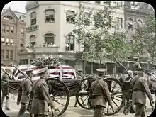 A funeral procession occurs during a state funeral on Pennsylvania or Constitution Avenue en route to the United States Capitol. Every funeral procession is led by a civilian police escort, usually by the D.C. Metropolitan Police Department.[69] Next, the formal, ceremonial aspects of a procession are organized. A funeral procession uses a four-wheeled caisson to transport the flag-draped casket, which was originally intended to carry a 75 mm cannon when it was built in 1918. The caisson is drawn by a draft-mix of 6 same-colored horses with three riders and a section chief mounted on a separate horse from the United States Army Caisson Platoon of the 3rd United States Infantry Regiment "The Old Guard". In addition, 2 sets of four body bearers (8 total) will march on foot alongside both sides of the caisson transporting the flag-draped casket. The entire funeral procession is composed of three march units consisting of National Guard, reserve, active-duty, and academy personnel that represent the six branches of the United States Armed Forces.[65] Moving at 3 miles per hour,[70] the funeral procession begins in sight of the White House and travels to the United States Capitol. For former presidents, the casket is unloaded from a hearse and transferred to a caisson at 16th Street and Constitution Avenue in view of the South Lawn.[2] The funeral procession then proceeds down Constitution Avenue. For sitting presidents, the casket is transferred at the North Portico entrance of the White House. Thereafter, the funeral procession proceeds down Pennsylvania Avenue. Two exceptions for this funeral procession were made during the state funerals of Gerald Ford on December 30, 2006, and George H. W. Bush on December 3, 2018. Respecting Ford's and Bush’s personal wishes of not having a funeral procession using a horse-drawn caisson, their caskets were transported in hearses to the United States Capitol. For Ford, the procession stopped at the National World War II Memorial in order to pay tribute to his service in the United States Navy during World War II.[71][72]