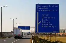 Once past the hills, the D.110 once again enters a mostly flat plain. Before the town of Malkara, the route intersects with the İL 59-53. About 10 km (6.2 mi) past Malkara, the route intersects with the D.555, which heads south to Şarköy.[5] Coming south from Balıkesir and Çanakkale, the Kınalı-Balıkesir Motorway, currently under construction, will parallel the D.110 for the remainder of its route east to Kınalı. Four exits connecting the motorway to the D.110 are planned and as of 2017, one is under construction, near Malkara. Once the route reaches Tekirdağ, it heads northeast, diverging from Atatürk Boulevard running through the city, and skims the outskirts as a beltway. This section of the road is named the Kanuni Sultan Suleiman Boulevard, after the 10th Sultan of the Ottoman Empire and intersects with another section of the D.555, followed by the D.565. East of Tekirdağ, the D.110 runs along the coast of the Sea of Marmara serving many vacation homes along the route. This portion of the route is named the Tekirdağ-Istanbul Road (Turkish: Tekirdağ-İstanbul Yolu). After passing just north of Marmaraereğlisi, the D.110 intersects with the D.567 and enters the Istanbul Province, shortly after.