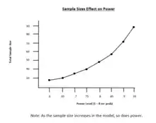 The sample size determines the amount of sampling error inherent in a test result. Other things being equal, effects are harder to detect in smaller samples. Increasing sample size is often the easiest way to boost the statistical power of a test. How increased sample size translates to higher power is a measure of the efficiency of the test – for example, the sample size required for a given power.[4]