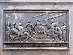 The sides were decorated with three bronze bas-reliefs commemorating scenes from the graf's history and an inscription was affixed to the front of the pedestal: