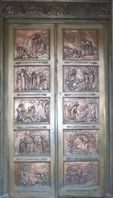 Two years later, in 1876, he donated the doors to the Bunyan Meeting House. The doors contain ten bas-relief panels, illustrating, like the panels on the base of the Bedford statue, scenes from the Pilgrims Progress. The design of the doors is based on the Gates of Paradise, by Ghiberti in the Battistero di San Giovanni in Florence. The Bunyan doors were executed by Fredrick Thrupp (1812-1895), in copper on bronze.