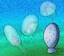 | Artists interpretation of S. crucicula as a Scyphozoan jellyfish and Vaveliksia vana | |