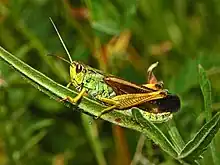 The adult males grow up to 18–20 millimetres (0.71–0.79 in) long, while the females reach 24–27 millimetres (0.94–1.06 in) of length.[4] It is the largest species of grasshopper in Europe. The basic coloration of the body varies from pale or bright green to yellow, with dark-brownish wings and tegmina. Femora of hind legs vary from yellow to reddish. In the males median and ulnar wing cells are quite large, with parallel veins. The adults usually live in colonies and the males emit whirring stridulations to attract females.[4]