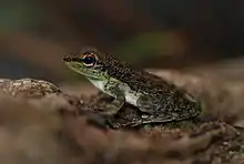 Staurois is a small genus of minuscule true frogs. Most species in the genus are restricted to Borneo, but two species are from the Philippines.[1][2] This genus is a quite ancient member of the true frog family, Ranidae.[3] They are typically found in or near rapidly flowing, small rocky streams, and are sometimes known as splash frogs or foot-flagging frogs. The latter name refers to their unusual behavior of conspicuously waving their hindlegs and feet, as a way of signalling other members of the species.[4][5] Similar behavior has also been documented in other frog genera, notably Hylodes and Micrixalus.
