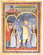In 1065, controversy arose when Anno II, Archbishop of Cologne, named Tegernon of Brauweiler abbot of Malmedy, on dubious authority—whilst Malmedy was in the archdiocese of Cologne, the two abbeys were linked and, thus, under the purview of the diocese of Liège, where Stavelot lay. This occurred despite several previous Imperial bulls reinforcing the position that the two abbeys should be subject to a single abbot.[26] The monks from Stavelot processed to Malmedy with the crosier and relics of St Remaclus to remind the rebellious monks of the traditional ordering of the abbeys that the saint had instituted. The relics and crosier were also transported to an Imperial Diet of Henry IV in Goslar. In 1066, they processed again, this time to Aachen and Fritzlar; they processed to Bitburg and Bamberg the following year. That their prayers were not answered apparently led the monks to despair that the relics were becoming impotent or that the monks were being punished by their patron; in 1067 and 1068, abbot Thierry even went to Rome to appeal to Pope Alexander II. This impasse lasted for a further three years, until Henry held court at Liège during Easter in 1071; with great ceremony, the monks processed with Remaclus's relics to meet with his legendary fellow bishop St Lambert, joined en route by the relics of St Symmetrus. Numerous miracles convinced the emperor to recognise the union of the two abbeys and reiterate the superiority of Stavelot, forcing Anno eventually to capitulate. A rejoiceful procession back to Stavelot paused en route to celebrate Mass on the banks of the Meuse; finally, the monks processed with Remaclus's relics to the abbey at Malmedy, to symbolise the restoration of his and their authority. This series of episodes is recounted in the heroic narrative of the Triumph of St Remaclus and confirmed by several contemporary sources.[14]